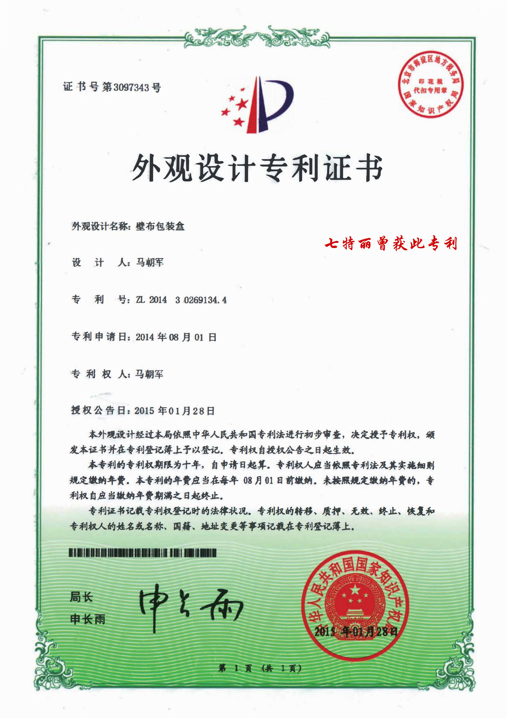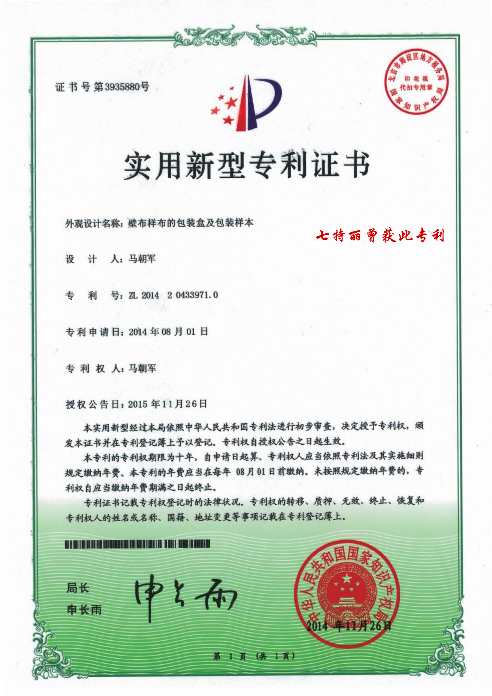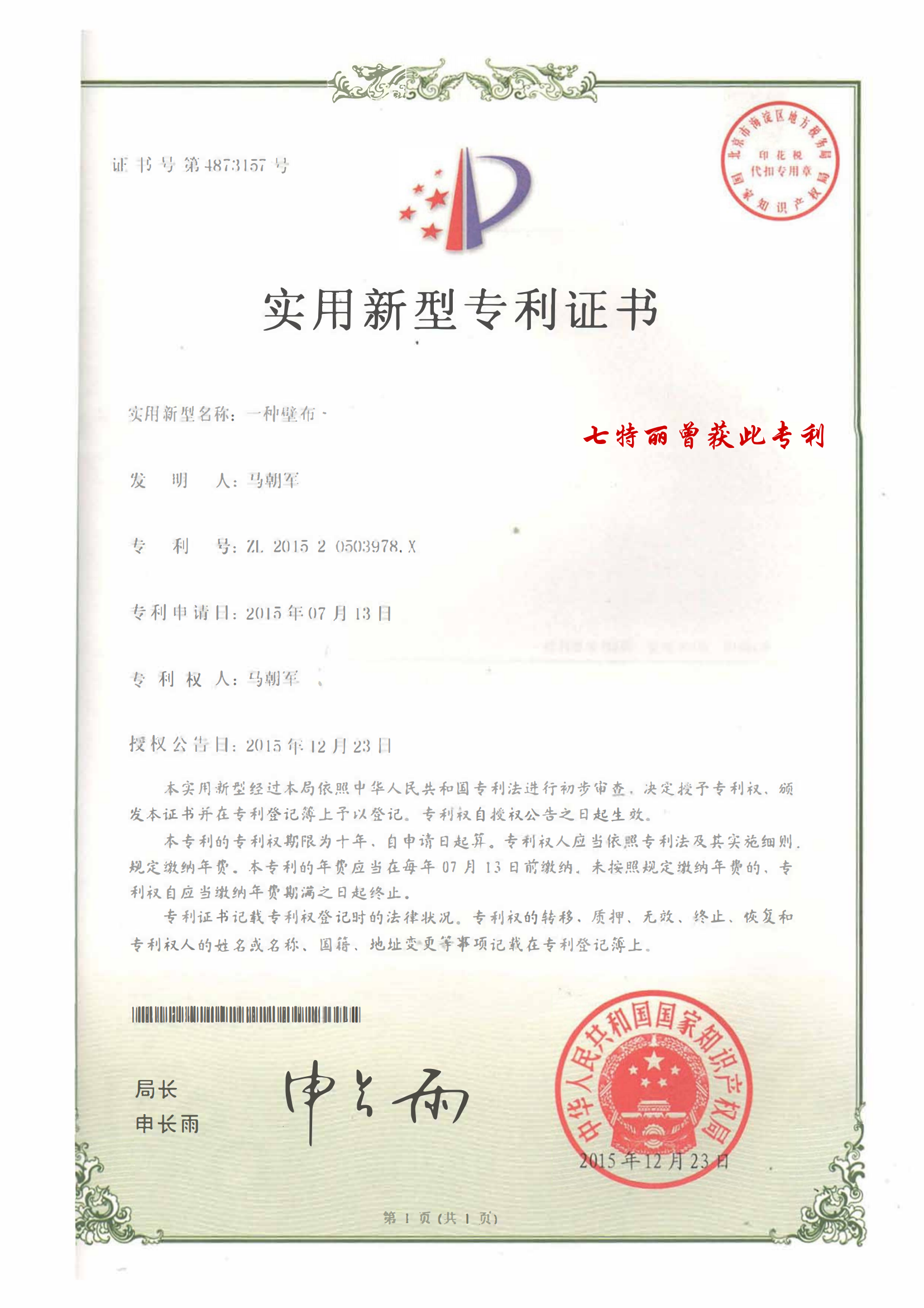 曾獲得壁布專利..